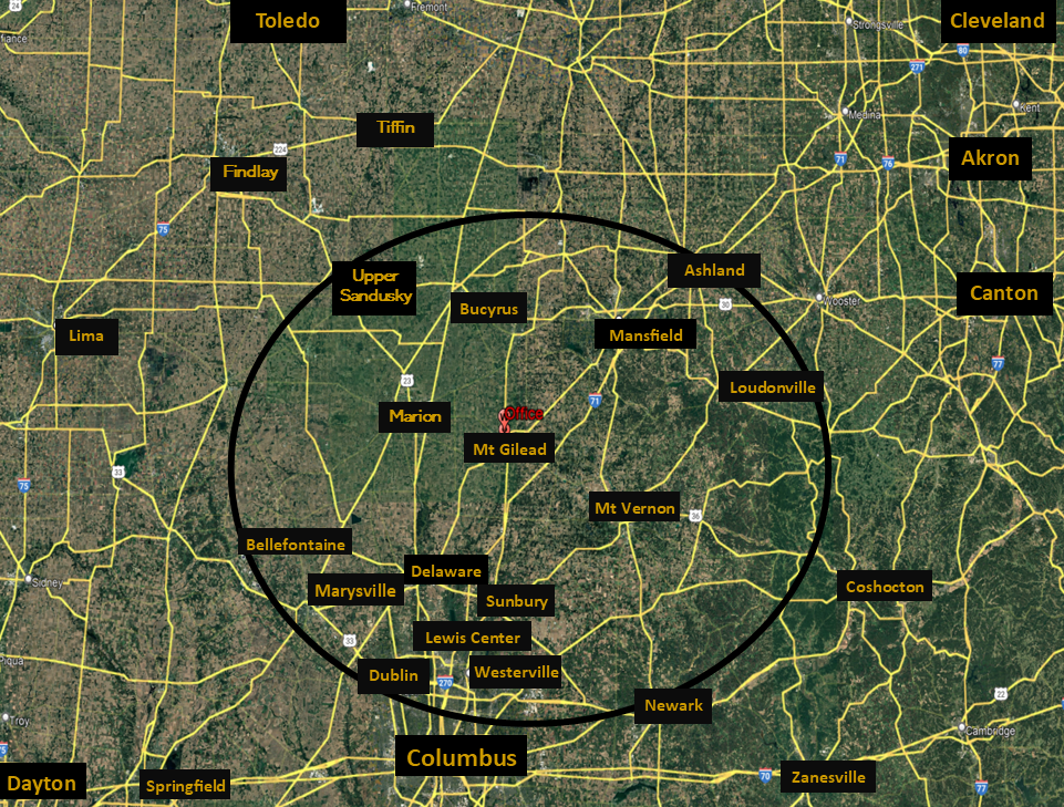 Towns/Cities: Marion, Mansfield, Mt Gilead, Bucyrus, Upper Sandusky, Ashland, Bellefontaine, Marysville, Delaware, Mt Vernon, Sunbury, Lewis Center, Powell, Dublin, Westerville, Newark, Loudonville, Galion, OH.